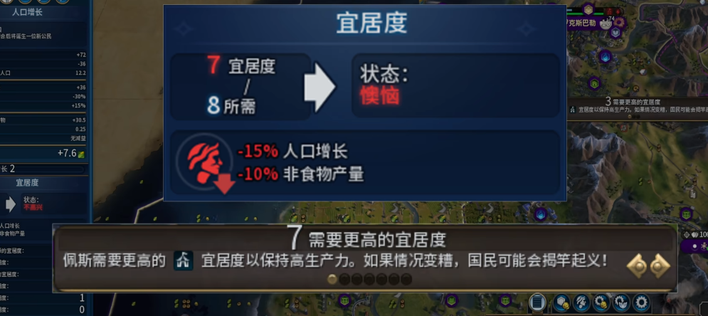 宜居度降至负值会立即削弱城市所有资源产出,包括科技、文化、信仰和生产力,并直接抑制人口的自然增长。当数值跌破零点,城市便进入不满状态,其发展效率将大打折扣,这会严重拖慢你的整体文明进程,让你在科技研发、文化传播和军事生产等关键领域落后于对手。
