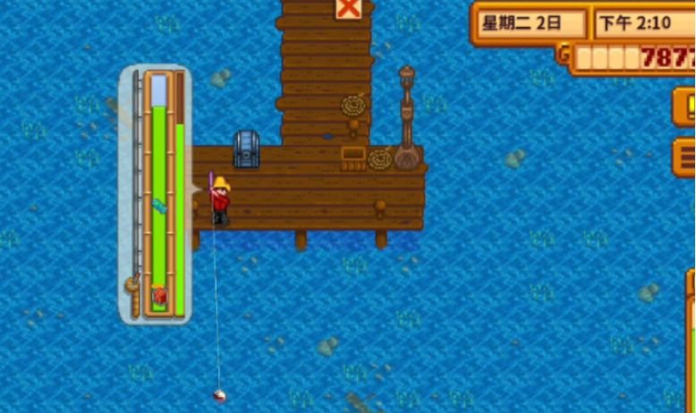 钓鱼的基础是获得鱼竿并学会操作,游戏初期渔夫威利会通过信件邀请你在特定时间前往海边,完成剧情后即可获得基础的竹鱼竿,之后可以在他的商店购买更高级的玻璃纤维竿和铱金鱼竿。高级鱼竿的优势在于可以安装鱼饵和鱼钩,从而显著提高钓鱼效率。钓鱼的基本操作是面对水域,按住鼠标左键或屏幕进行蓄力,绿色进度条越满则抛竿距离越远,抛得远更容易钓到高品质的鱼。