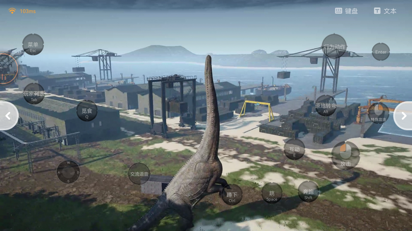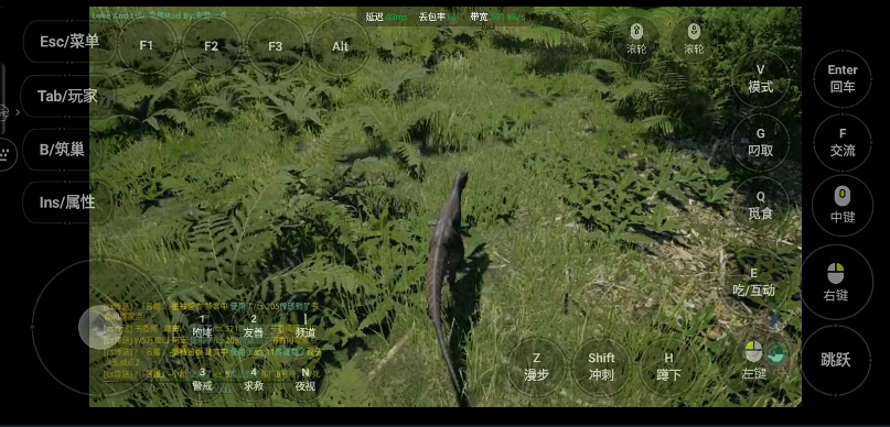 开局先稳定生存状态,时刻关注饥饿值与水分值,肉食龙需击杀其他恐龙获取龙肉,草食龙在地图各处寻找植物,按M打开地图找到蓝色淡水区域,在水边出现提示时长按E或双击E完成进食与喝水,双击E可自动持续补充,也能通过属性页消耗积分快速恢复。移动用WASD控制,配合SHIFT开启奔跑,Z键切换慢走模式不消耗体力,CTRL+C进入潜行减少被发现概率,F键可切换咆哮、友善、警戒、求救等交流指令,夜晚开启N键夜视能更清晰观察周围环境。