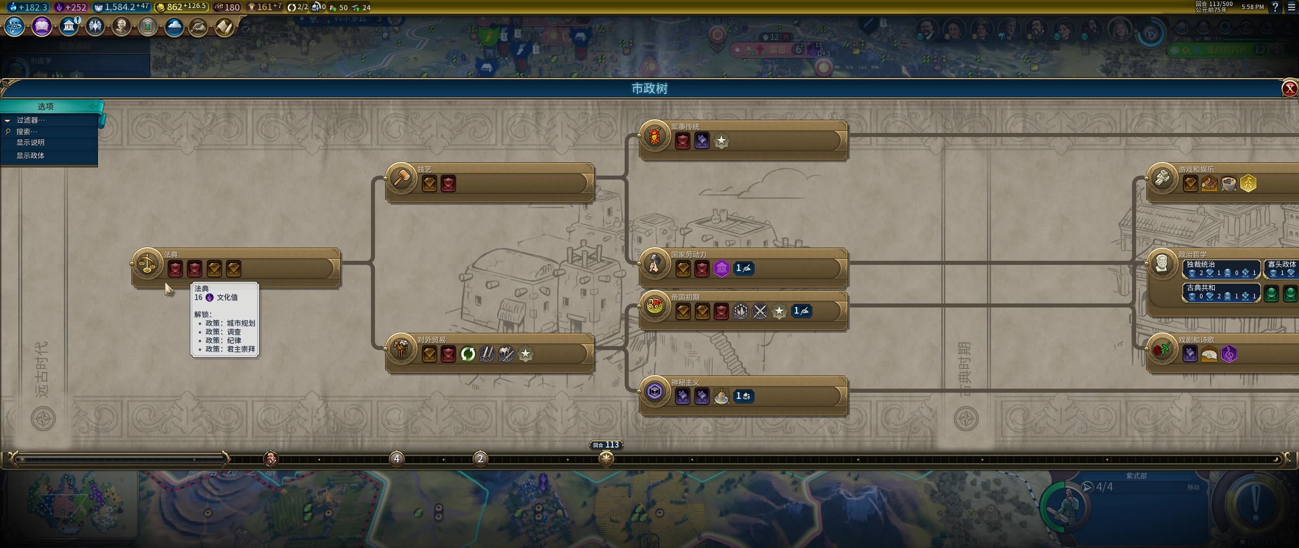 市政发展要与科技高度同步,古典时代优先解锁自然哲学政策卡,启用后让学院区相邻加成翻倍,中世纪跟进理性主义等政策卡,强化高人口城市的学院建筑产出。政策槽位全力向科研倾斜,减少军事、经济类政策的占用。积极结交并成为科技城邦的宗主国,日内瓦等城邦能提供全局科技值加成,科技城邦还能提升所有学院建筑的科研效率。总督选择偏向科研向,派驻平伽拉等总督到核心城市,放大人口科技产出与城市整体科研效率。